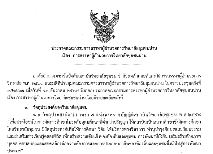 ประกาศคณะกรรมการสรรหาผู้อำนวยการวิทยาลัยชุมชนน่าน