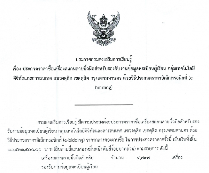 ประกวดราคาซื้อเครื่องแสกนลายนิ้วสำหรับรองรับงานข้อมูลทะเบียนผู้เรียน สิ้นสุดรับฟังข้อคิดเห็น 3 มี.ค. 68