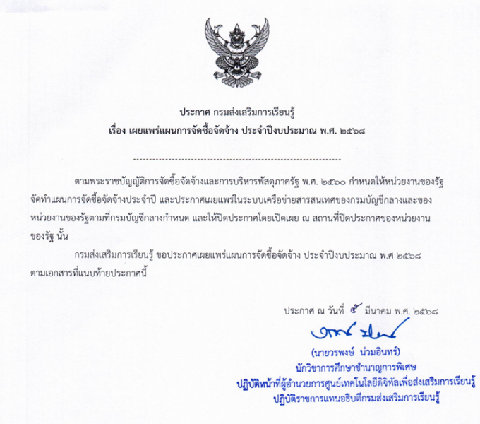 เผยแพร่แผนการจัดซื้อจัดจ้าง ประจำปีงบประมาณ พ.ศ. 2568 จัดเช่าอุปกรณ์การเรียนการสอน