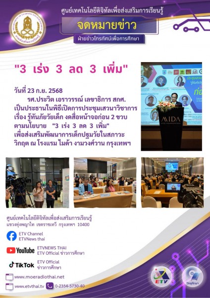 จดหมายข่าว 3 เร่ง 3 ลด 3 เพิ่มรู้ทันภัยวัยเด็ก งดสื่อหน้าจอก่อน 2 ขวบ