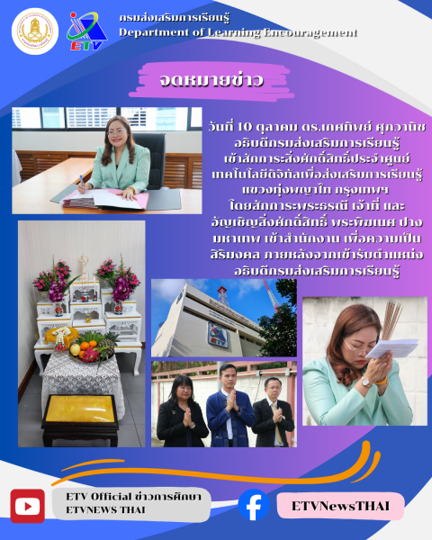 - "เสริมสิริมงคล" ดร.เกศทิพย์ ศุภวานิช อธิบดีกรมส่งเสริมการเรียนรู้ เข้าสักการะพระธรณี เจ้าที่ และอัญเชิญสิ่งศักดิ์สิทธิ์ พระพิฆเนศ ปางมหาเทพ เข้าสำนักงาน ณ ศูนย์เทคโนโลยีดิจิทัลเพื่อส่งเสริมการเรียนรู้