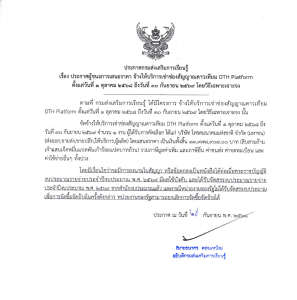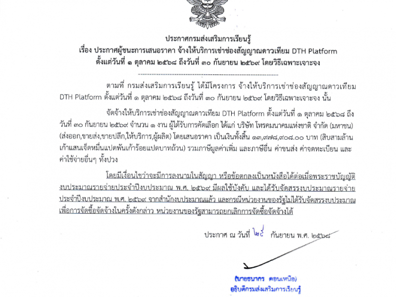 ประกาศผู้ชนะการเสนอราคา จ้างให้บริการเช่าช่องสัญญาณดาวเทียม DTH Platform ตั้งแต่วันที่ 1 ตุลาคม 2568 ถึงวันที่ 30 กันยายน 2569 โดยวิธีเฉพาะเจาะจง