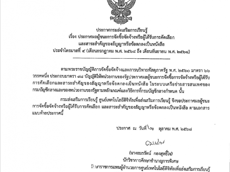 ประกาศผลผู้ชนะการจัดซื้อจัดจ้างหรือผู้ได้รับการคัดเลือกและสาระสำคัญของสัญญาหรือข้อตกลงเป็นหนังสือ ประจำไตรมาสที่ 4 (เดือนกรกฎาคม พ.ศ. 2568 ถึง เดือนกันยายน พ.ศ. 2568)